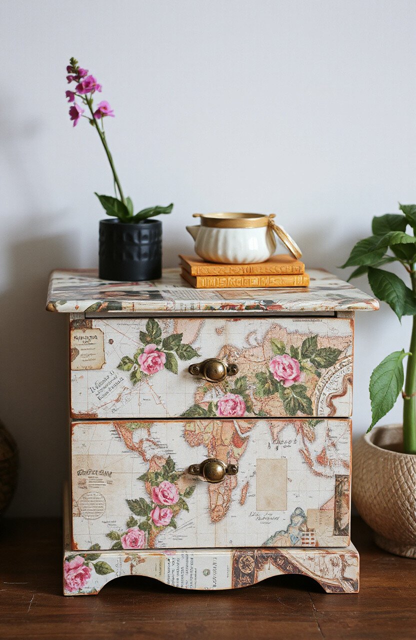 Transform old boxes or furniture into new masterpieces. This technique allows you to recycle materials and personalize your home. You can use any paper, from magazines to old maps.