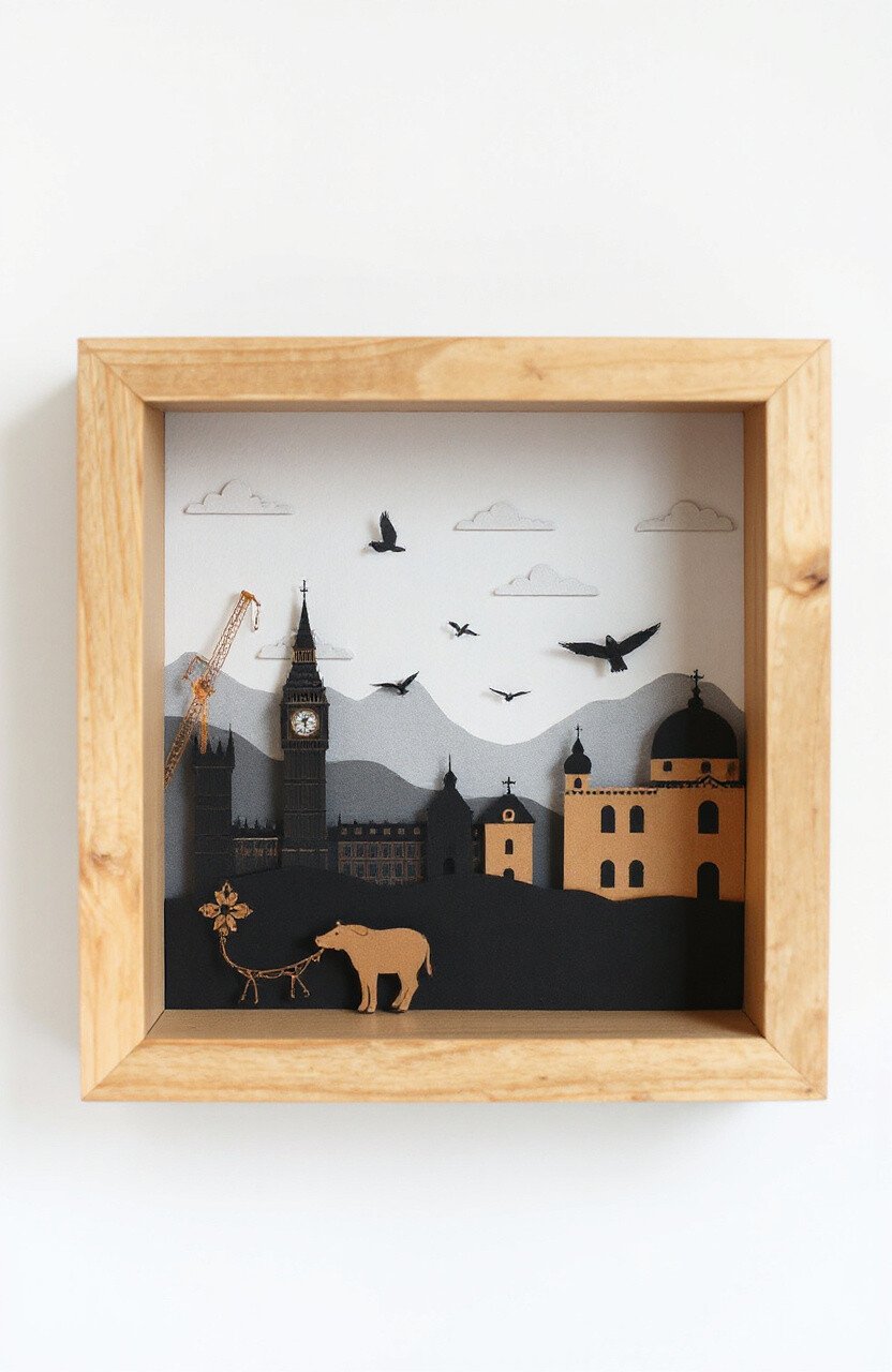Shadow box art involves layering paper inside a box frame to create a scene with depth. It’s like a mini-theater with paper actors.