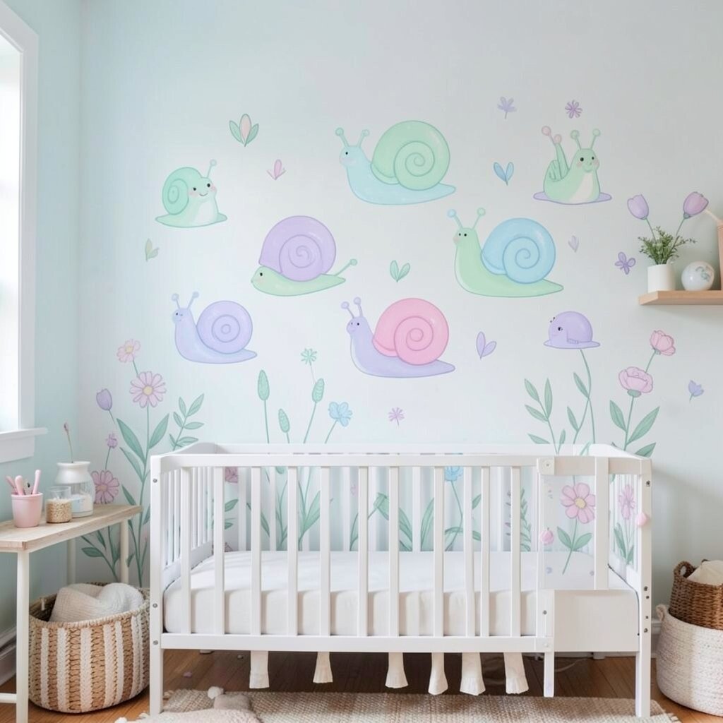 Snails in pastel hues like mint and lavender can add a unique touch to your nursery. Their slow, steady nature is both calming and charming.