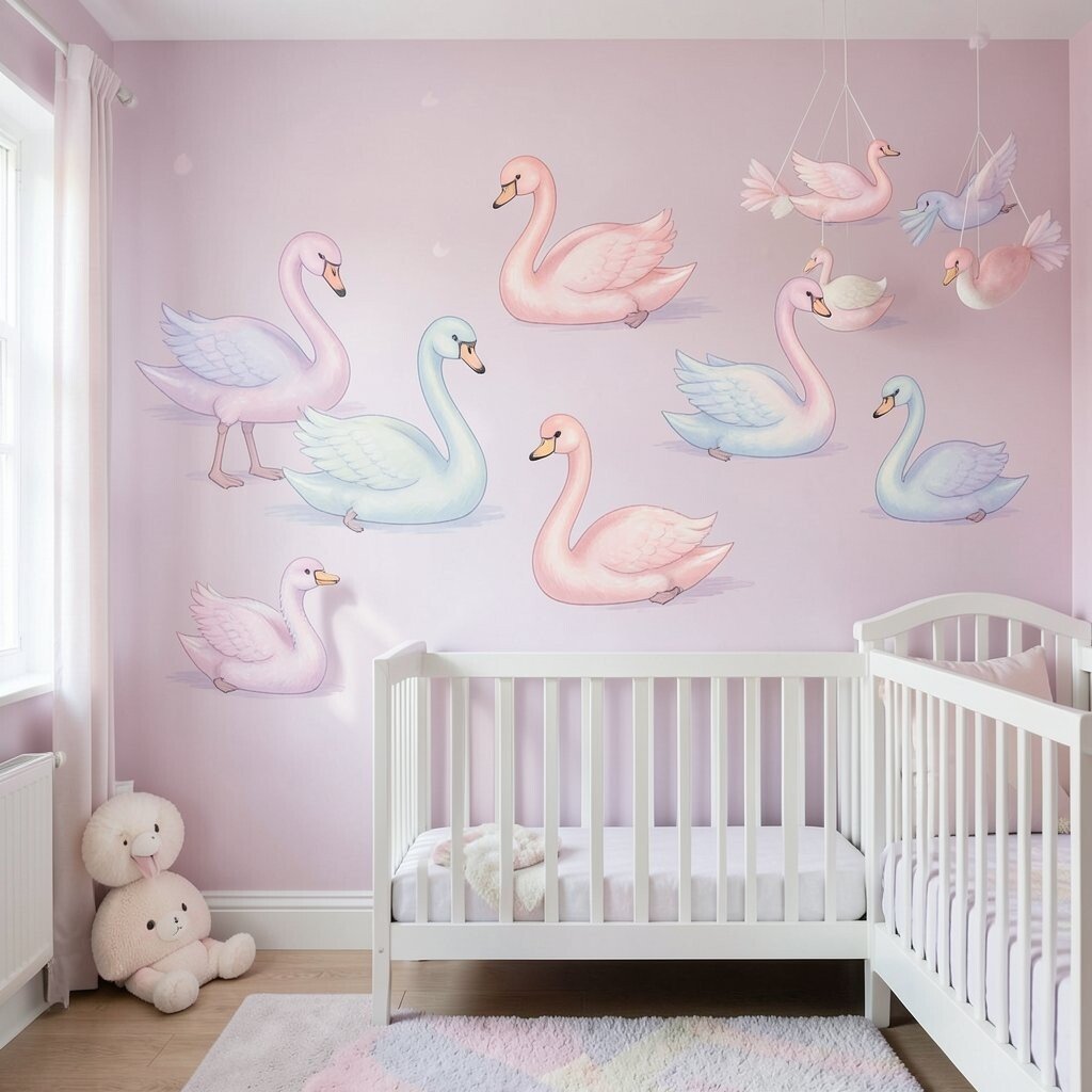Swans in gentle pastels bring grace and elegance to a nursery. Picture them gliding serenely across the walls in shades of soft pink and lavender.