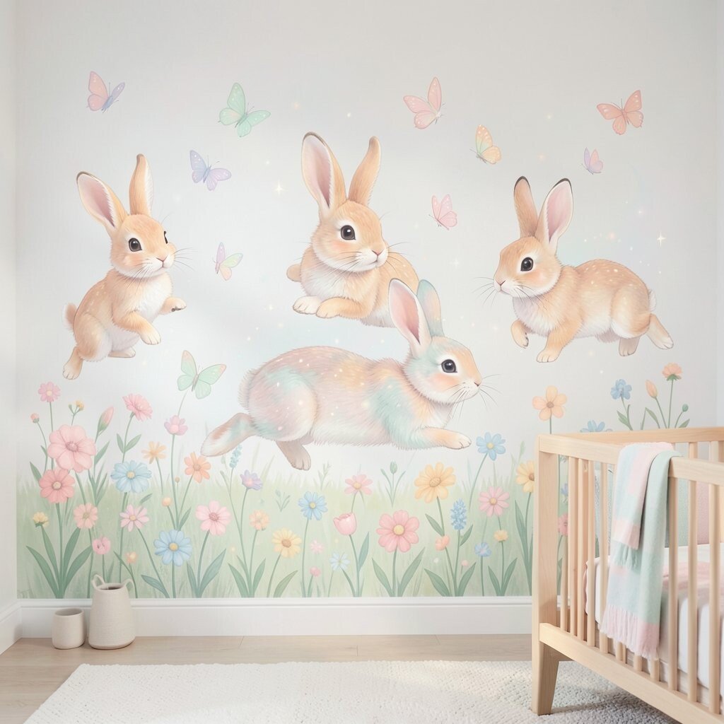 Consider a meadow scene with flowers and butterflies. Rabbit decals or wall art can be found starting at $28, making them an enchanting addition.