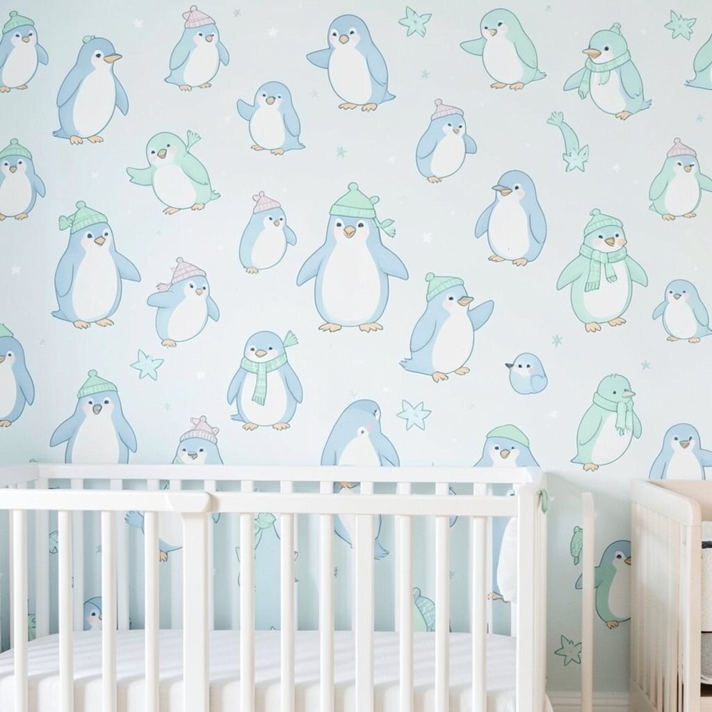 Penguins in soft blue and mint green tones can bring a cool, calming vibe to any nursery. Their waddling, adorable shapes are sure to make your baby giggle.