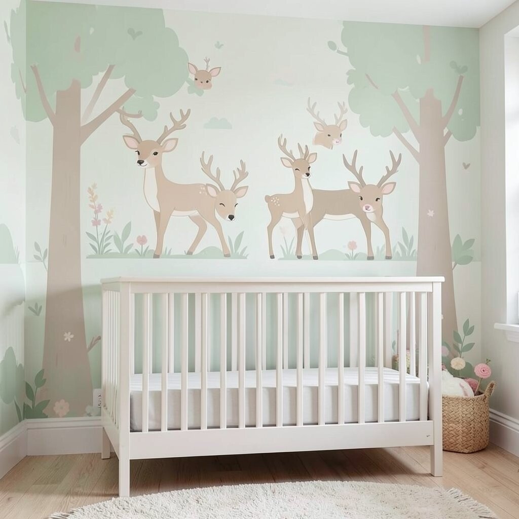 Deer in pastel tones like beige and light green can add a woodland charm to the nursery. Their gentle nature and big eyes are simply enchanting.
