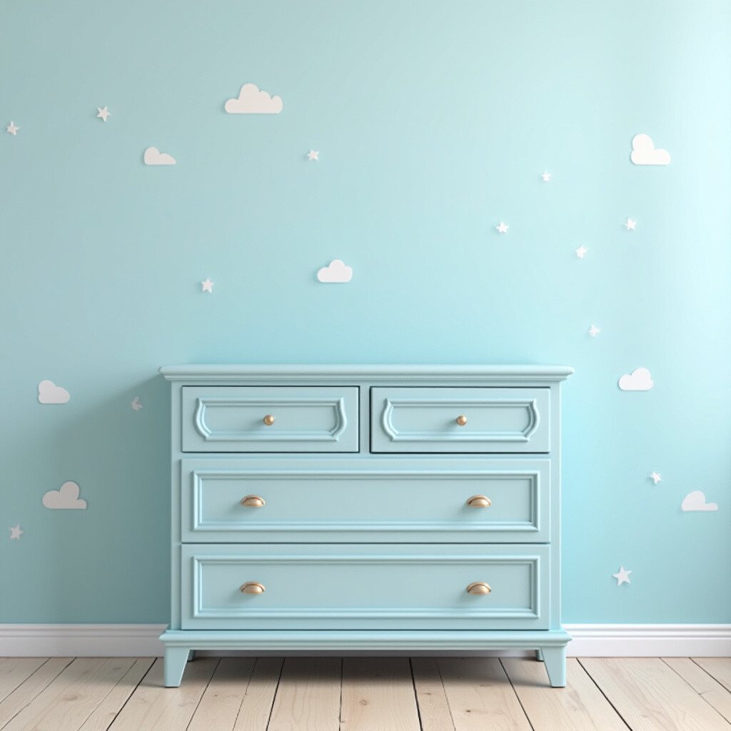 Combine it with white or soft pastels for a dreamy look. Sky blue paint is widely available and comes in various finishes. Add some cloud-themed decor for a whimsical touch!
