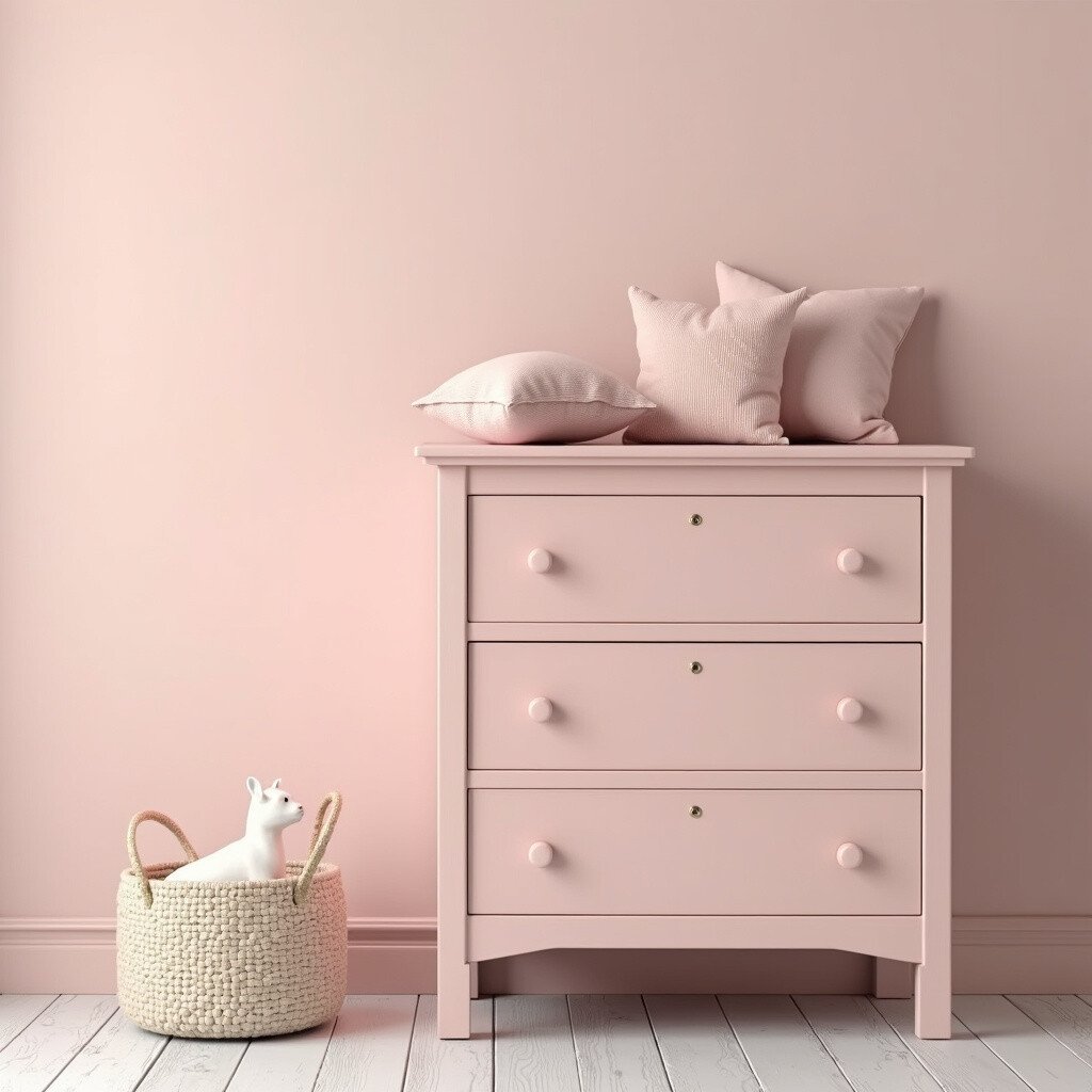 Consider using lace or floral patterns to enhance the vintage feel. Pink paint is widely available and comes in various shades to match your preference. Add a mirror with a pink frame to complete the look.