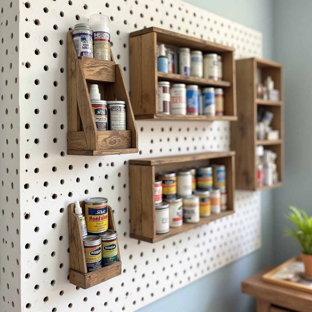 Create mini-shelves on your pegboard for a chic display of paint tubes. Think of them as tiny stages, showcasing each tube like a star. It’s a stylish way to keep your paints organized and within reach.