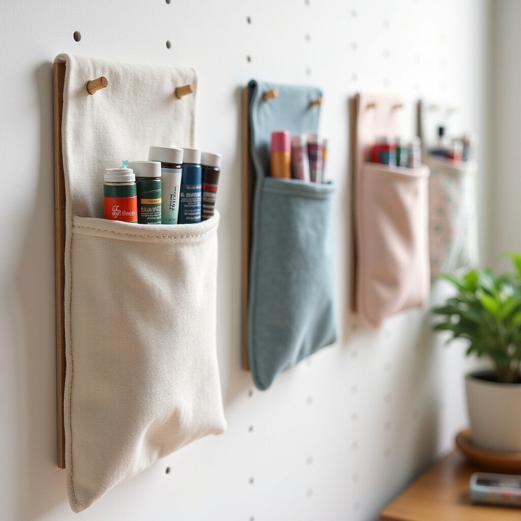 Fabric pouches hang gracefully from your pegboard, each one holding several paint tubes. It’s a soft and elegant way to keep your paints organized and within reach.