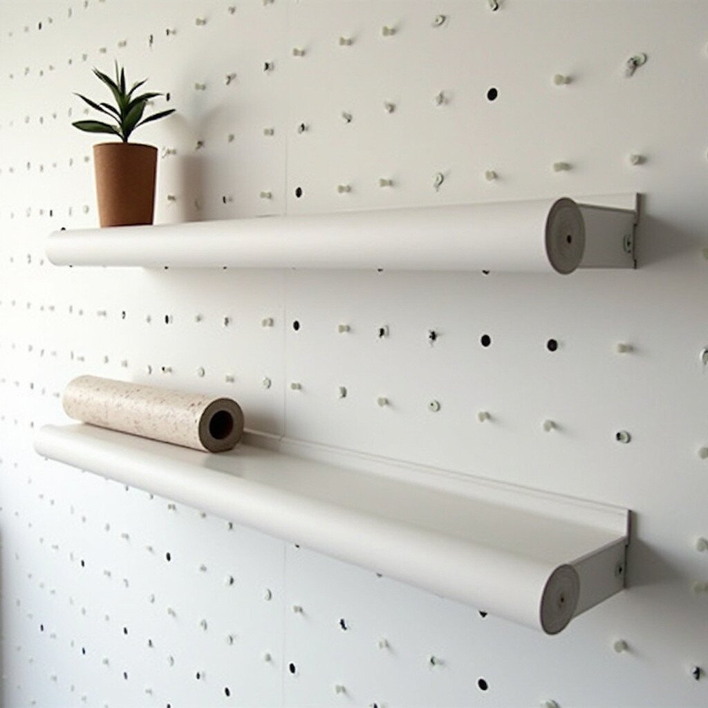 Integrate floating shelves into your pegboard for a sleek and modern look. This setup combines style with functionality.