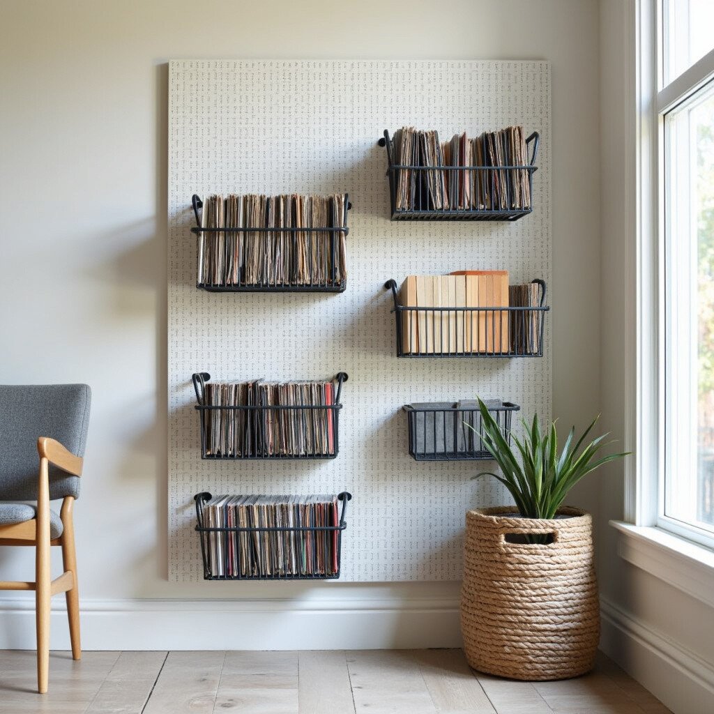 Attach wire baskets to your pegboard for storing vinyl rolls. This method is functional and stylish, offering plenty of storage space.
