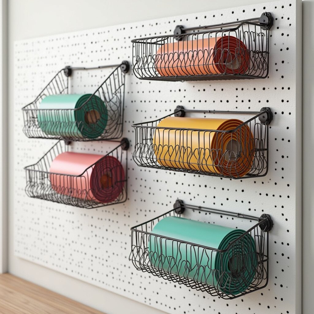 Attach wire baskets to your pegboard to hold groups of vinyl rolls. This makes it easy to grab a bunch of rolls at once without having to remove them individually. It’s practical and adds a rustic charm to your space.