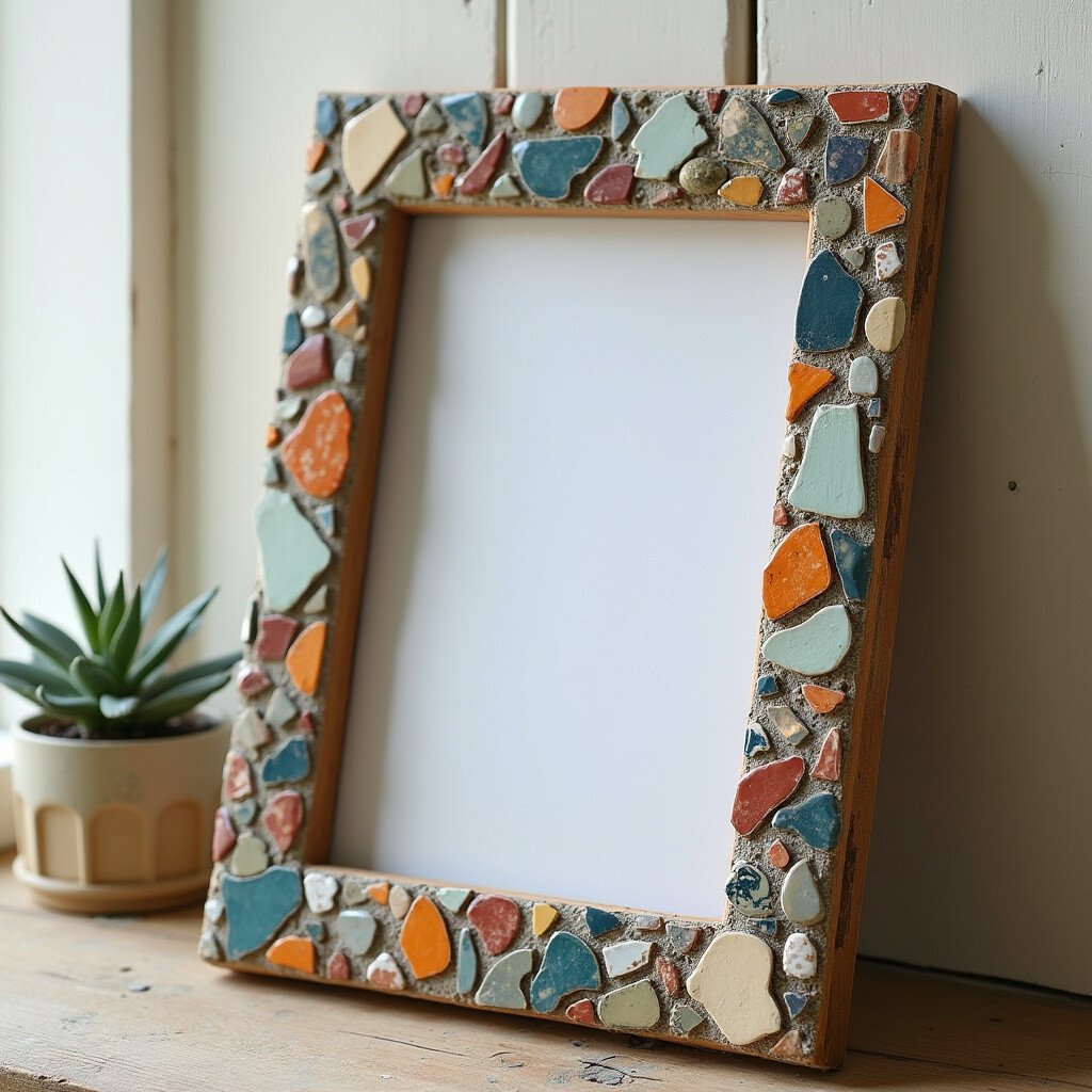 Create a mosaic photo frame using small tiles or broken pottery pieces. Arrange them in a pattern of your choice for a stunning, artistic look. This idea adds a touch of elegance to any photo.