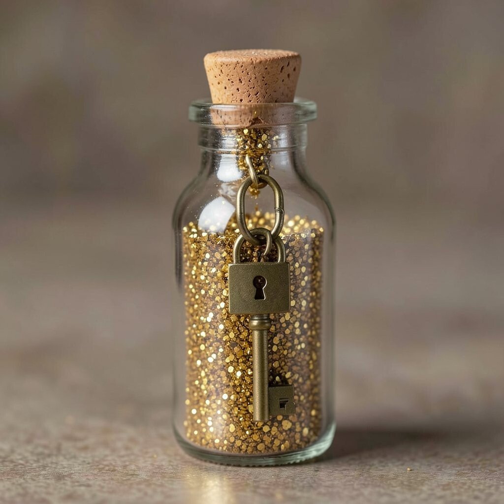 Capture the charm of vintage keys with a bottle filled with gold glitter and a tiny key charm. It’s like having a piece of history in a bottle. This idea is perfect for vintage lovers and history buffs.
