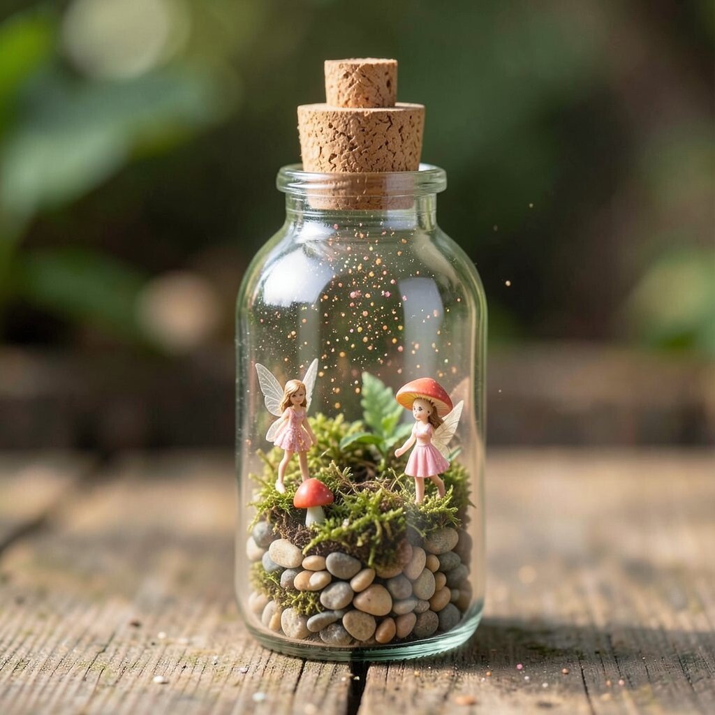 Capture the essence of a fairy garden with a bottle filled with tiny pebbles, moss, and a sprinkle of pixie dust. It’s like having a miniature garden you can carry anywhere. You can add tiny figurines of fairies or mushrooms for extra charm.