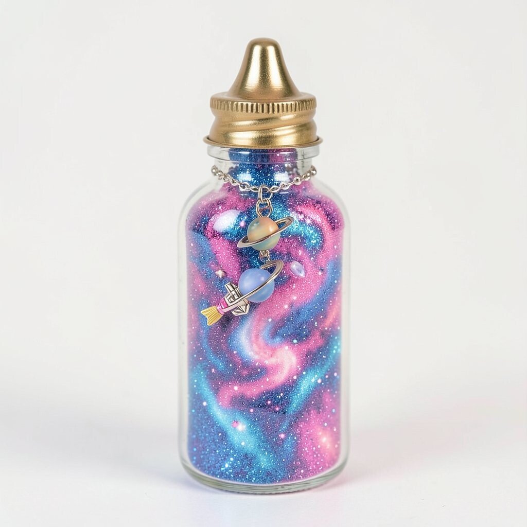 Create a nebula theme with swirling colors of glitter in pink, blue, and purple. It’s like capturing a nebula in a bottle. This bottle is perfect for space lovers and science enthusiasts.