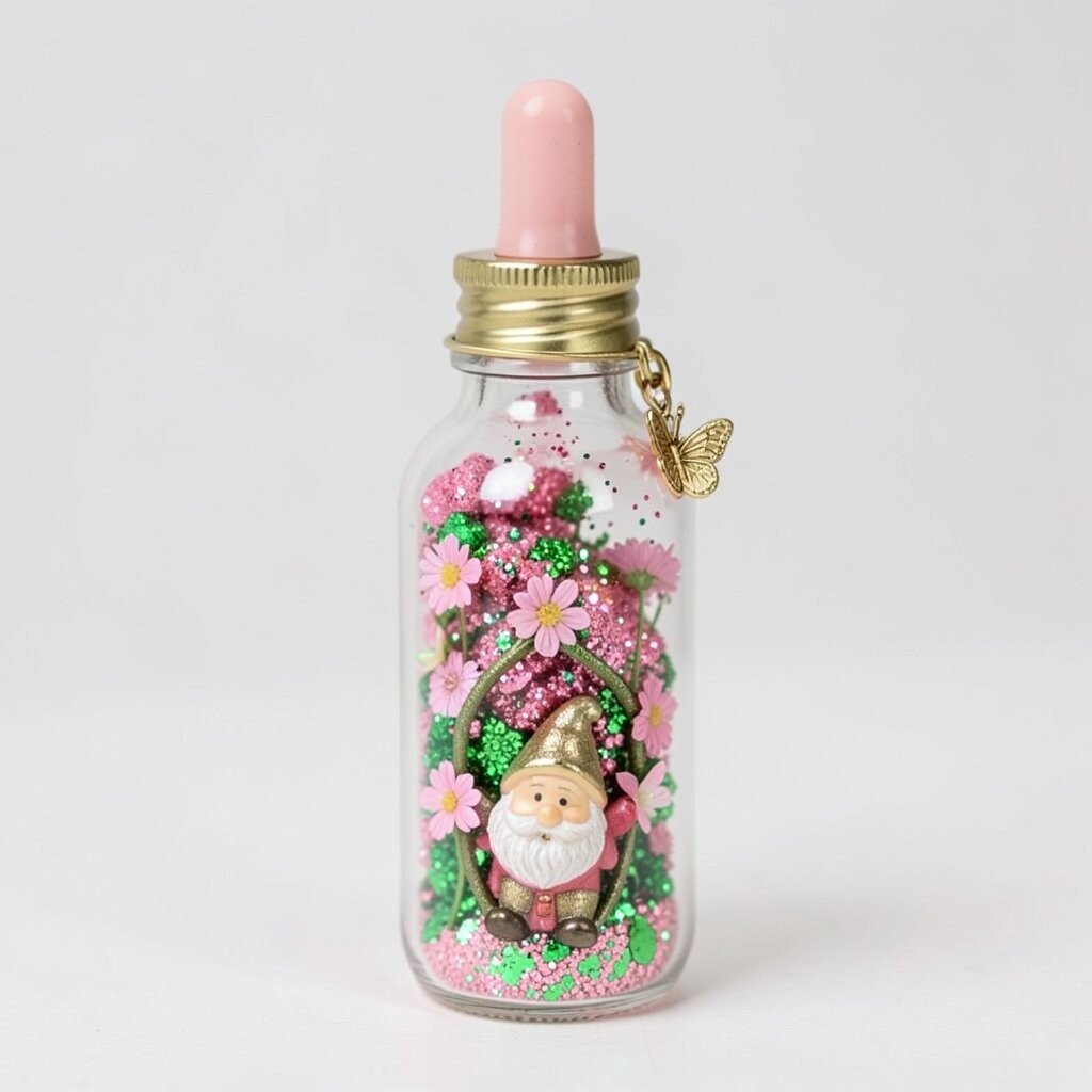 Fill a bottle with pink and green glitter, tiny flowers, and a garden gnome charm. It’s like carrying a piece of the garden with you. This bottle is perfect for garden lovers and flower enthusiasts.