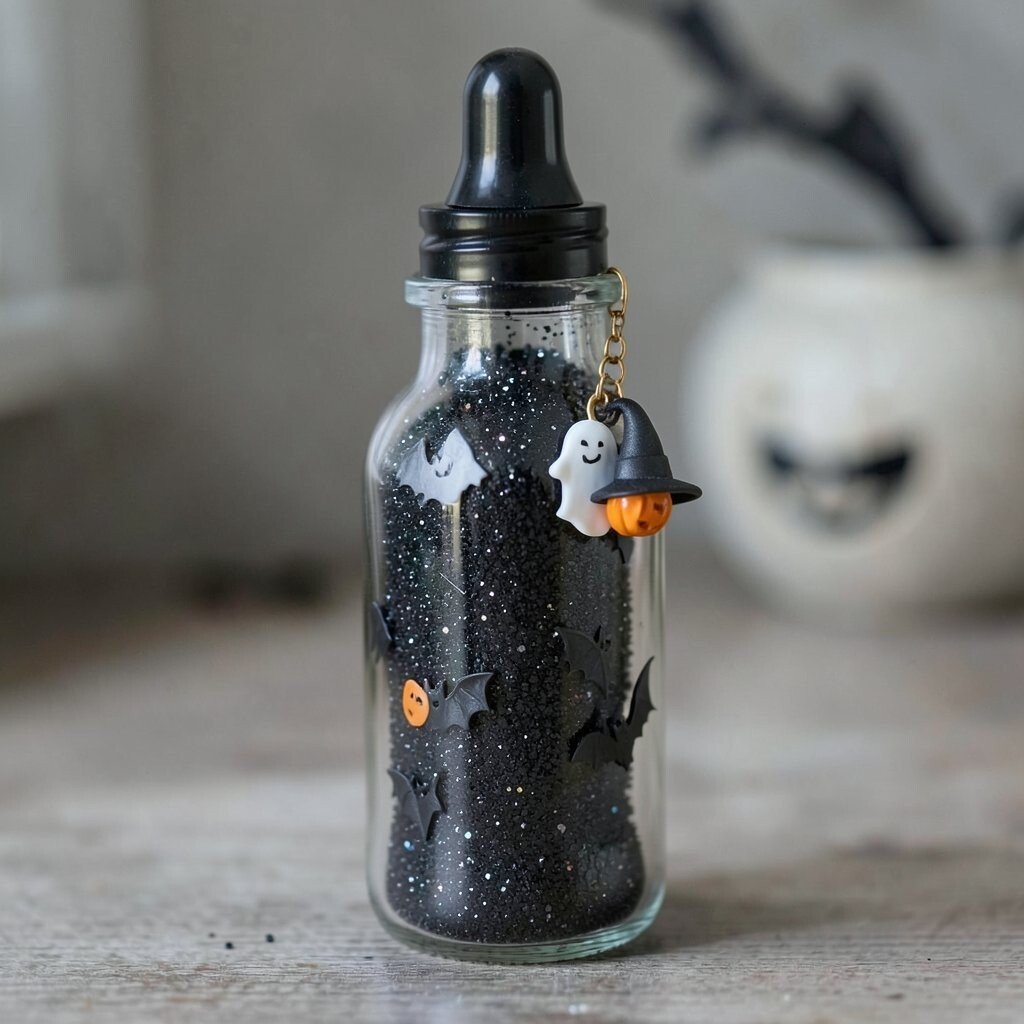 Create a spooky theme with black glitter, tiny bats, and a pumpkin charm. It’s like having a piece of Halloween magic in a bottle. This bottle is perfect for Halloween lovers and spooky enthusiasts.