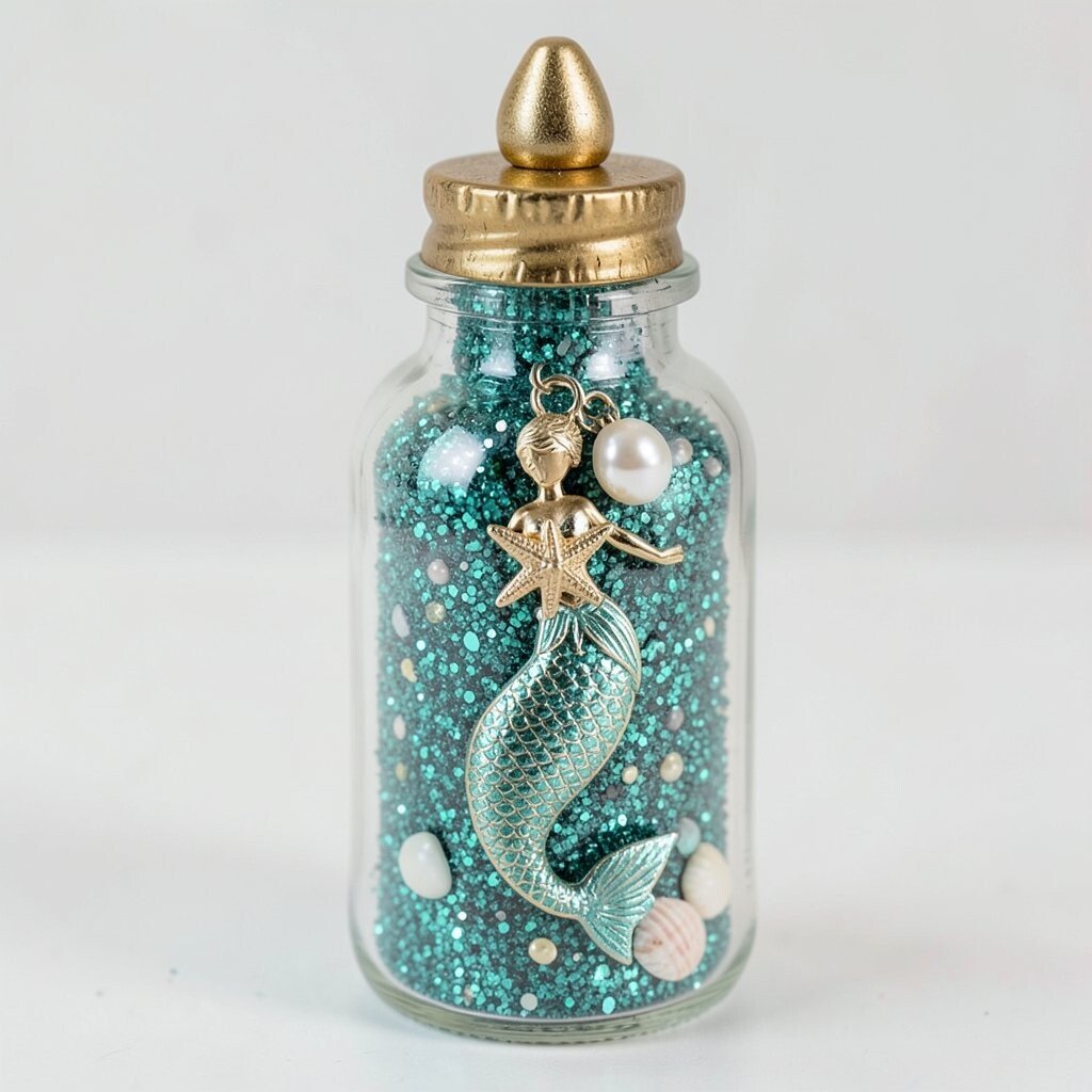 Create a mermaid theme with teal glitter, tiny seashells, and a mermaid charm. It’s like having a piece of a mermaid’s world in a bottle. This bottle is perfect for mermaid lovers and ocean enthusiasts.