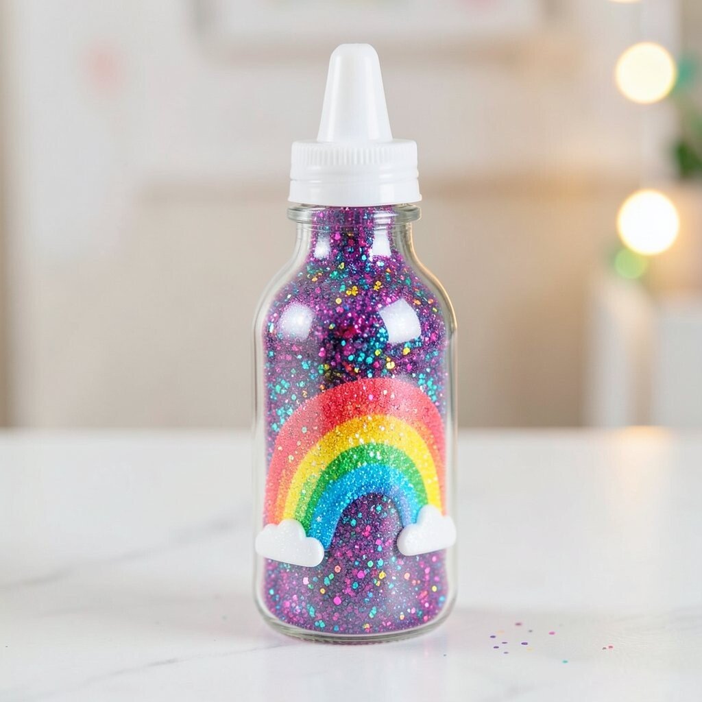 Fill a bottle with rainbow-colored glitter for a cheerful and vibrant look. It’s like capturing a rainbow in a bottle. This design is perfect for adding a pop of color to any room.