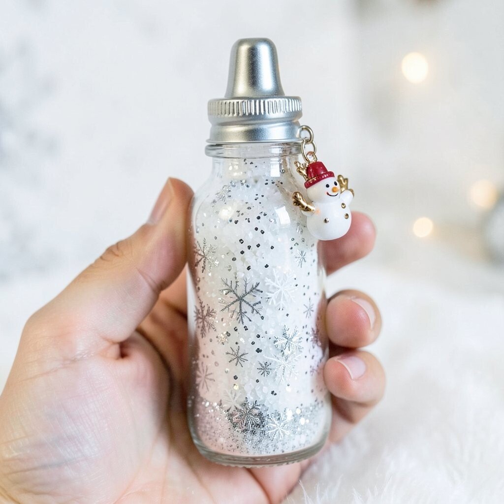 Capture the magic of winter with a bottle filled with white glitter, tiny snowflakes, and a pinch of silver dust. It’s like having a piece of winter right in your hand. You can add a small snowman or reindeer charm for a festive touch.