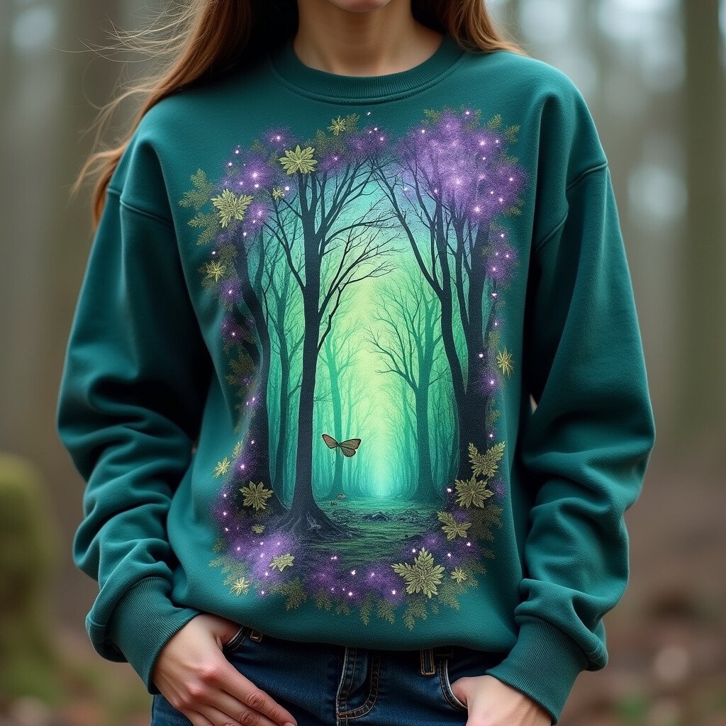 Natural browns, greens, and creams blend into a warm, earthy palette. This sweatshirt is perfect for nature lovers. It’s like a walk in the woods captured in fabric.