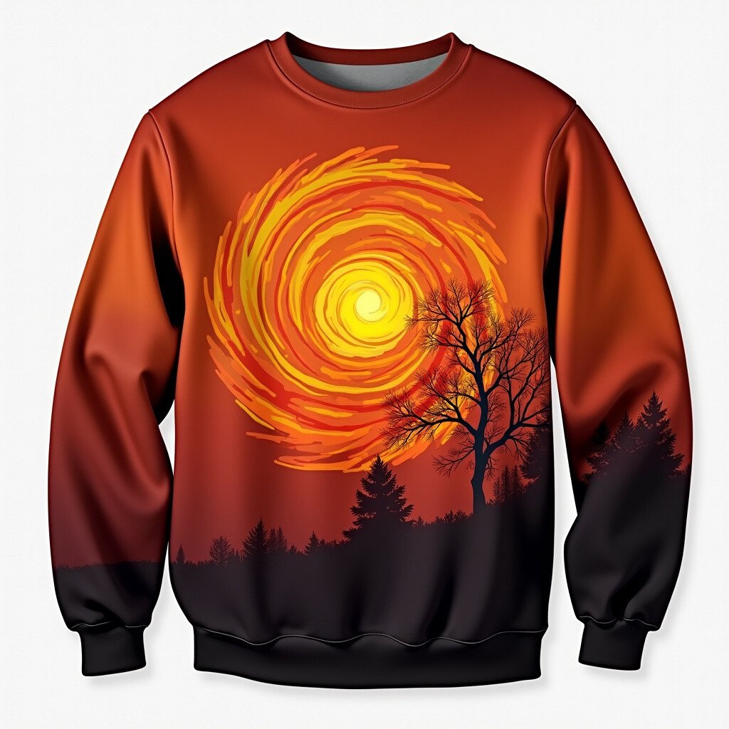 This sweatshirt captures the beauty of a setting sun with its warm oranges and reds. It’s like wearing a sunset.