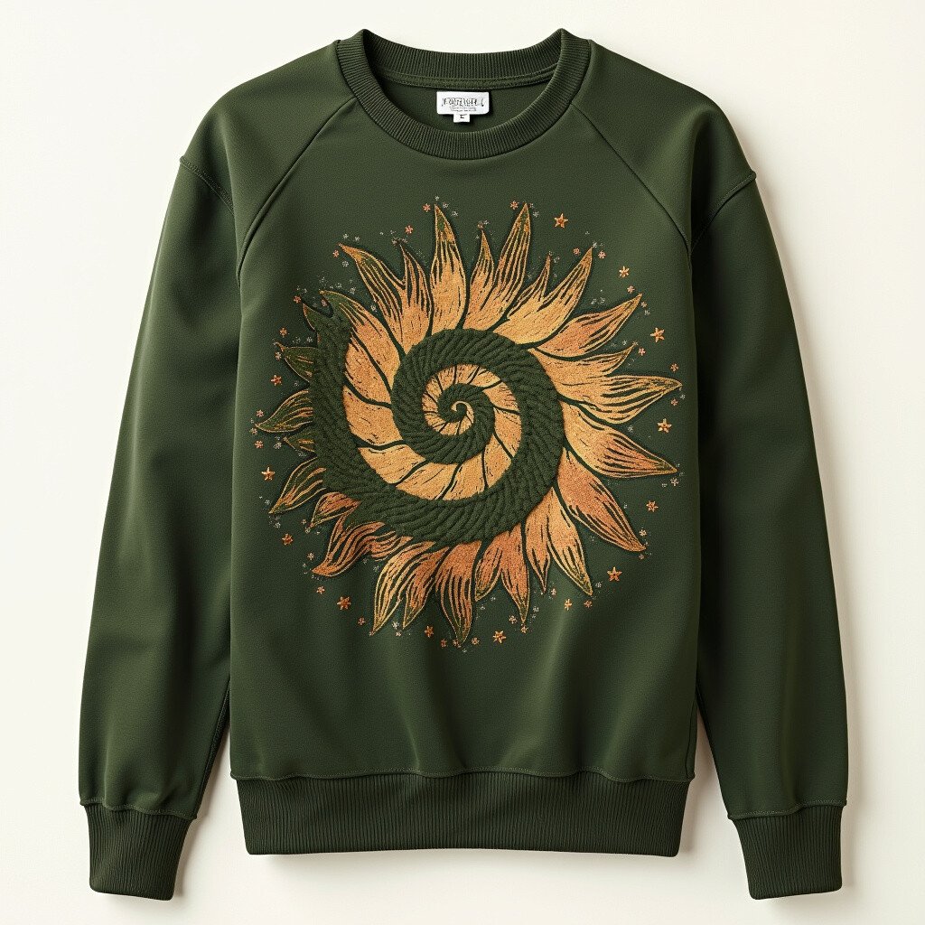 With muted earth tones and a soft spiral design, this sweatshirt screams retro cool. It’s like taking a walk down memory lane.