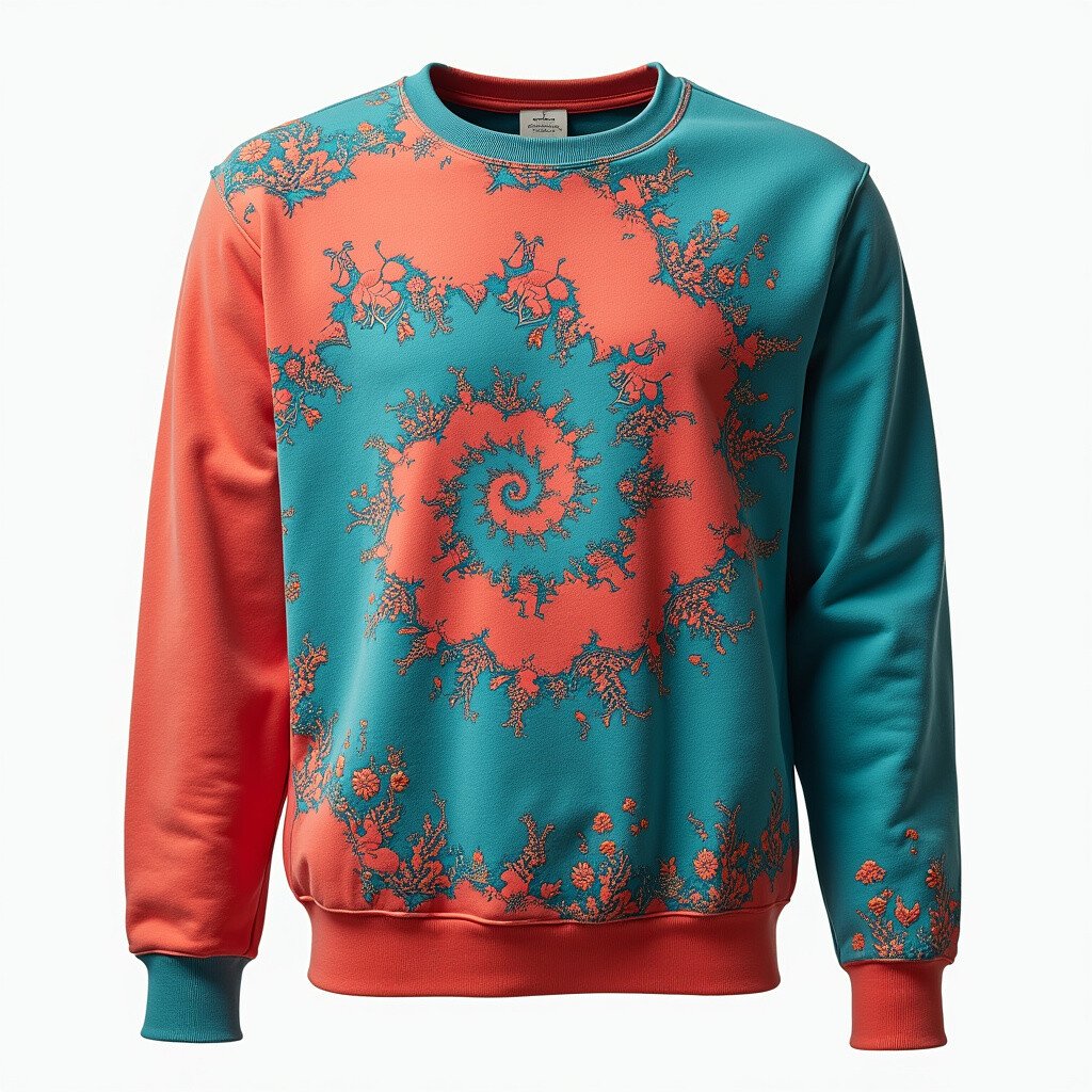 This sweatshirt swirls with vibrant corals and teals, like an underwater reef. It’s lively and colorful.