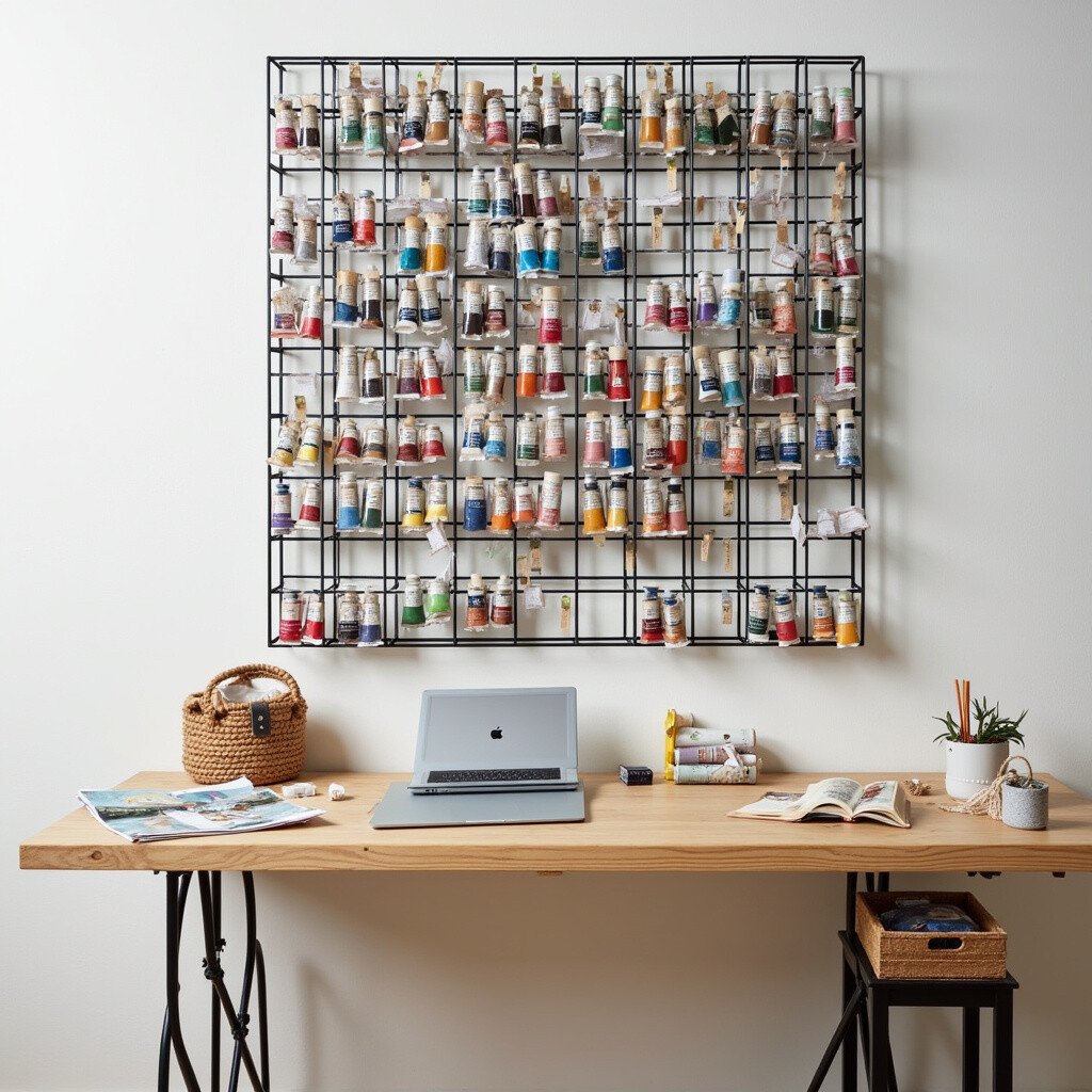 It’s like having a constantly changing art piece in your studio. The grid can be a focal point, and it keeps your paints organized and accessible. Find these grids at home decor stores.