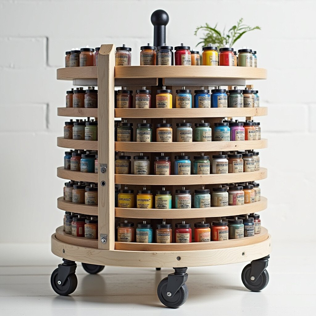 Repurpose a spinning spice rack for your paints. Each tier can hold several tubes, making it easy to find the color you need. Place it on a shelf or hang it for more space.