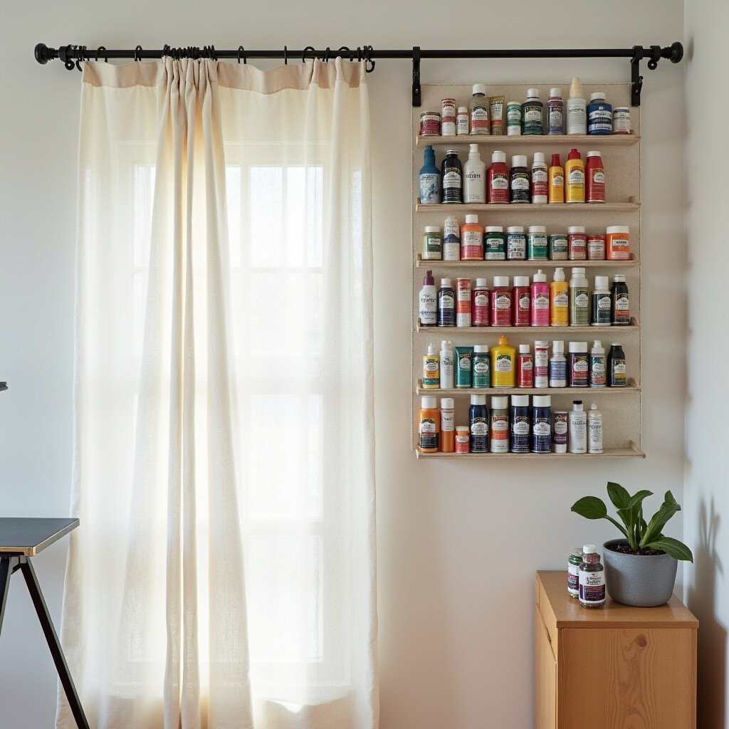 It’s an unexpected way to use a curtain rod, creating a streamlined look. You can even add small curtains for a theatrical reveal of your paints.