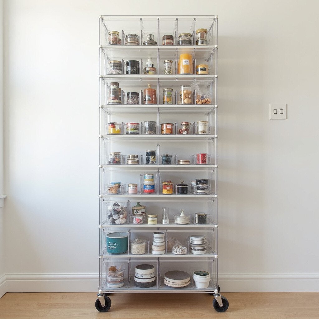 Clear acrylic bins make it easy to see what you have. Mount them on the wall in a vertical arrangement. The transparency keeps your space looking open and bright.