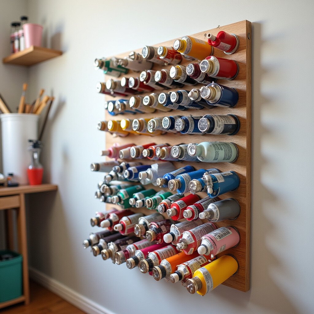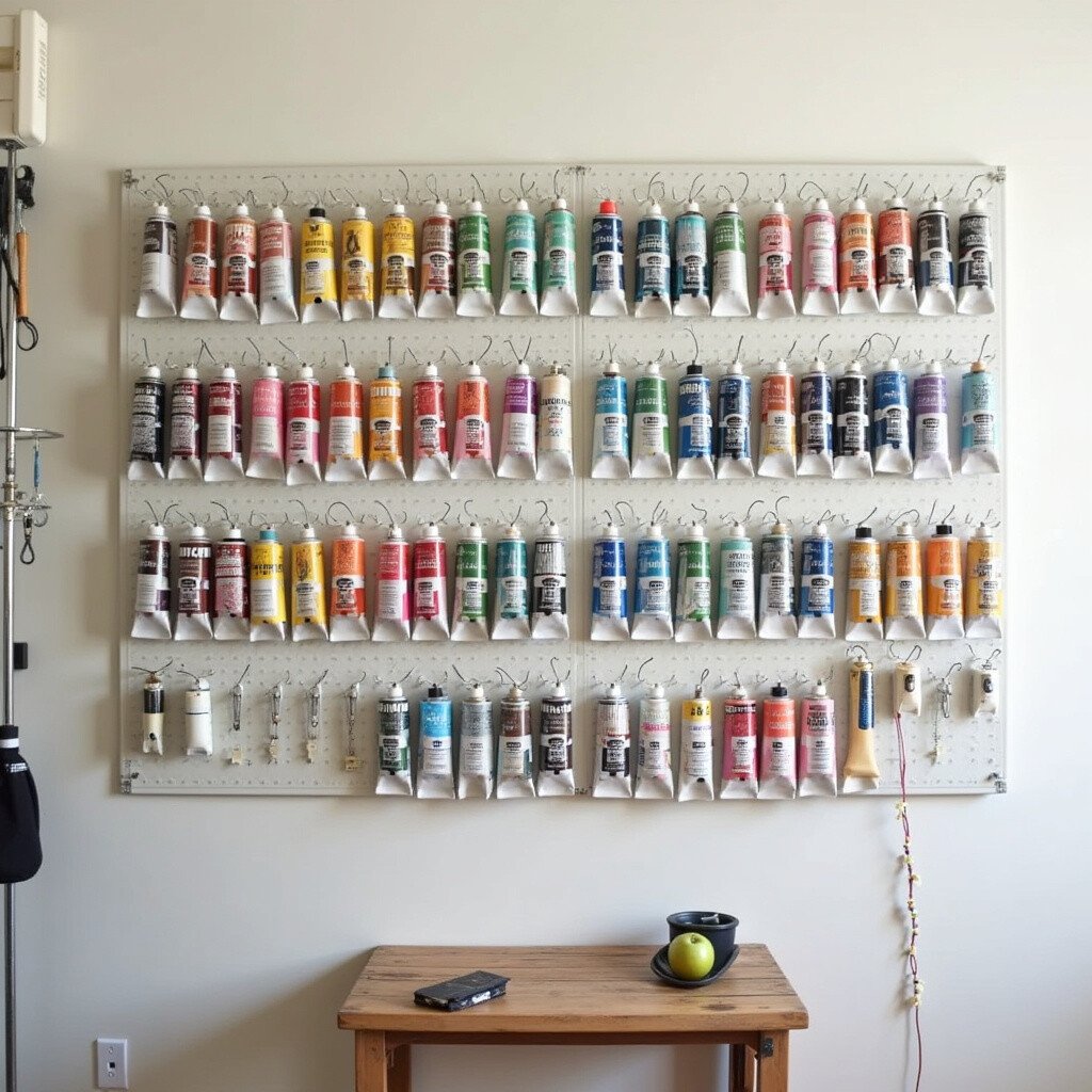 Pegboards are incredibly versatile. Hang a pegboard on your wall and use hooks to hang your paint tubes vertically. You can arrange them by color, size, or brand.