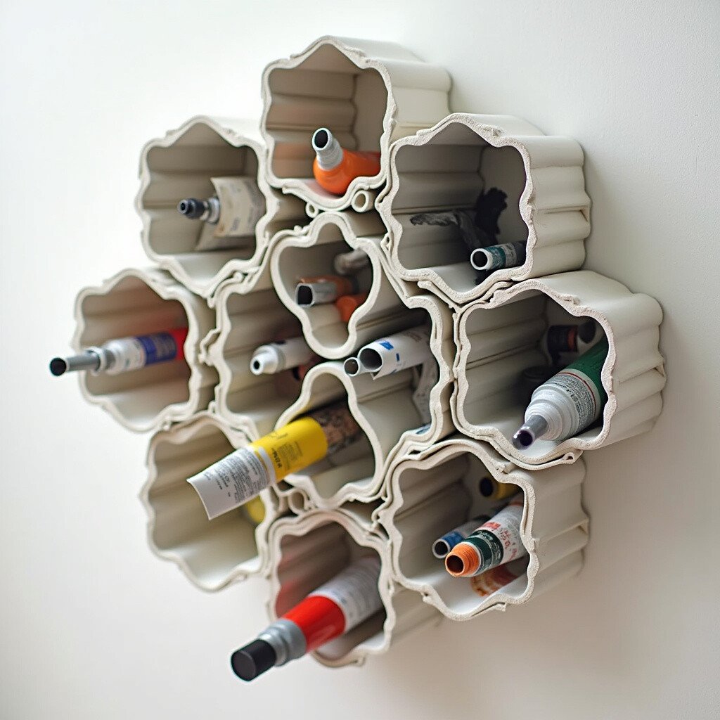 Create a honeycomb structure with PVC pipes. Cut them into sections and glue them together in a pattern on the wall. Each pipe acts as a cubby for a paint tube.