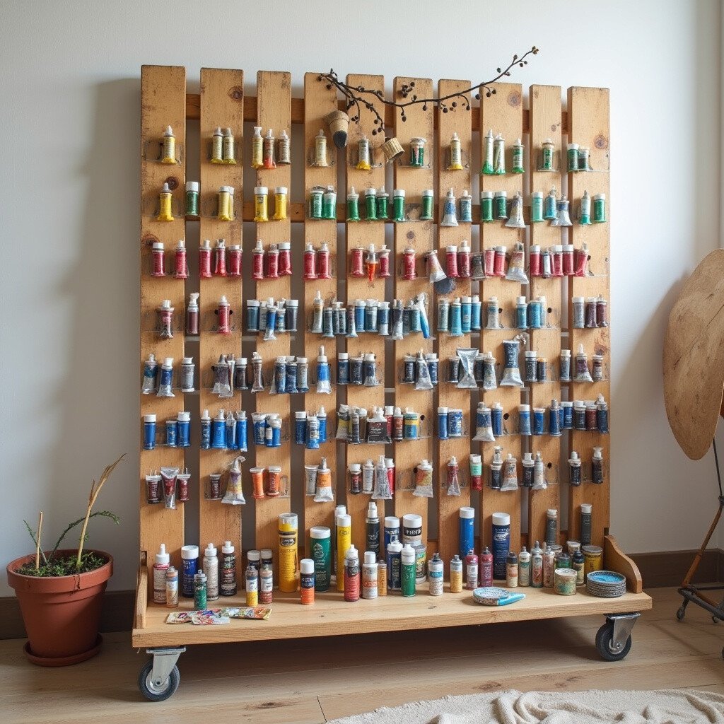 Wooden pallets offer a rustic charm. Stand one against the wall and use the slats to hold paint tubes. Each slot can accommodate a different color family.