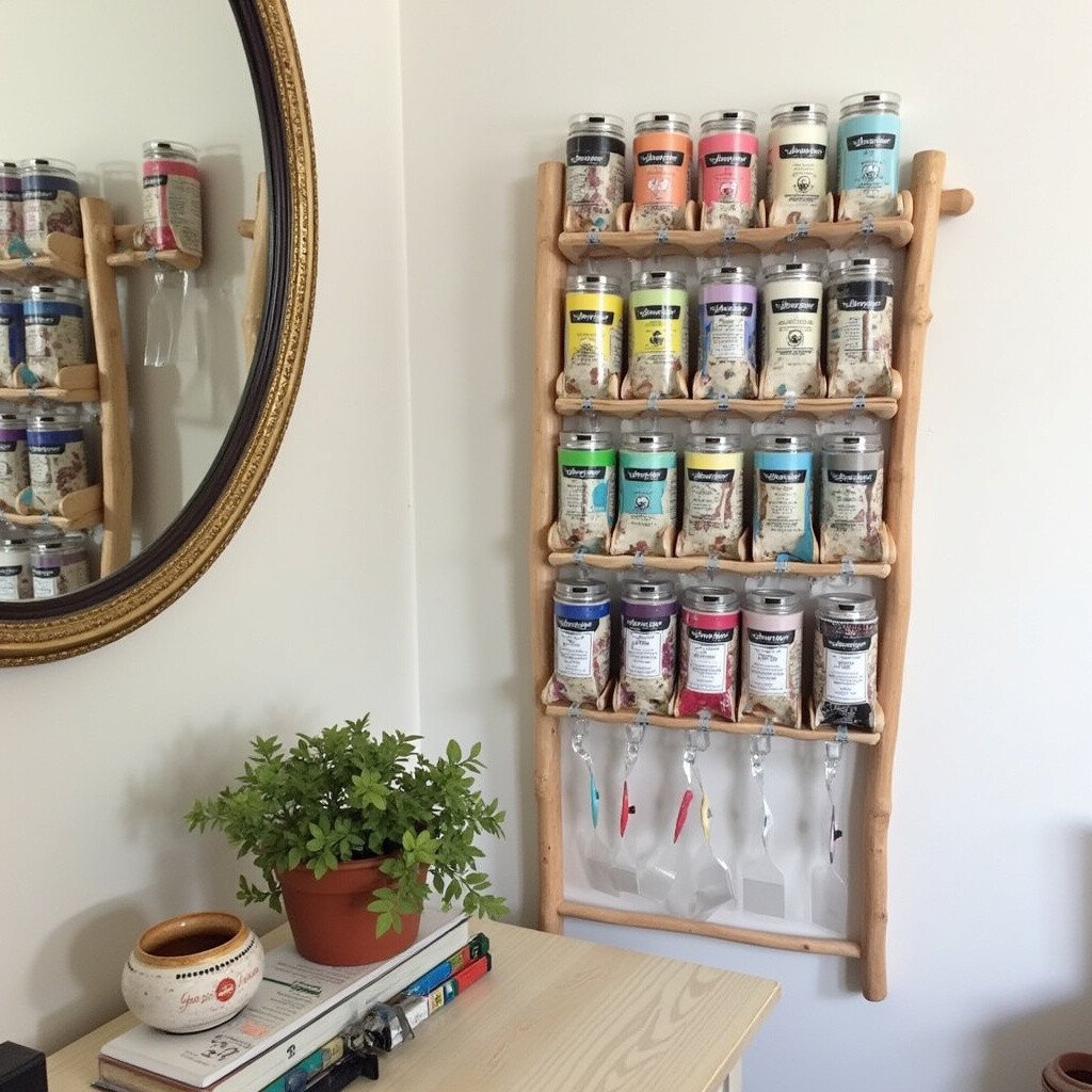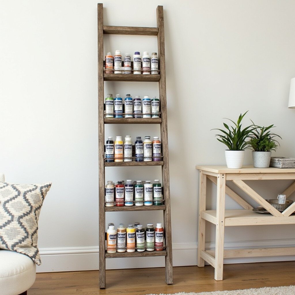 Ladders aren’t just for climbing! Lean a wooden ladder against the wall and use the rungs as shelves for your paint tubes. This is a perfect blend of practicality and style.
