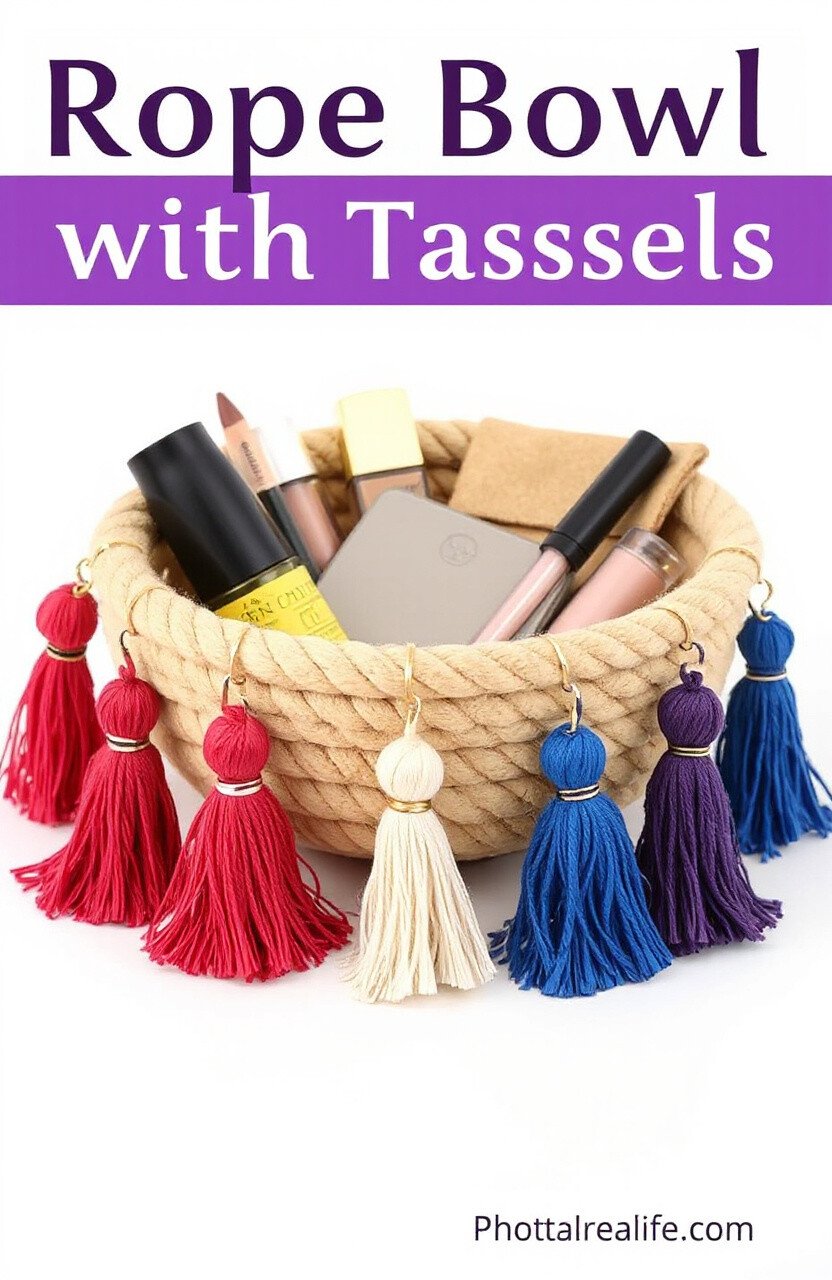 Choose tassel colors that contrast with the rope for a striking look. This bowl is ideal for organizing makeup or craft supplies.