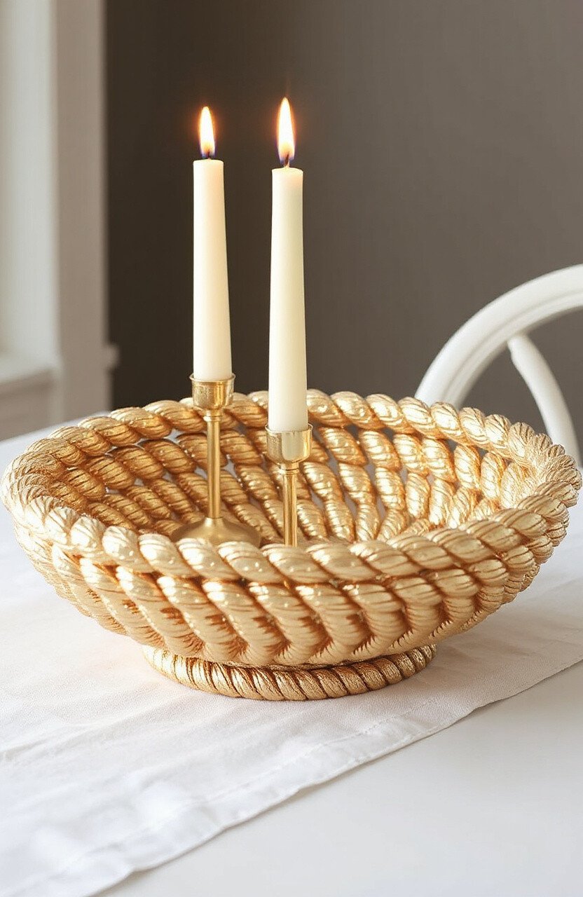 Shiny and chic, a metallic rope bowl is the epitome of elegance. Use metallic spray paints to achieve this look. It’s perfect for special occasions.