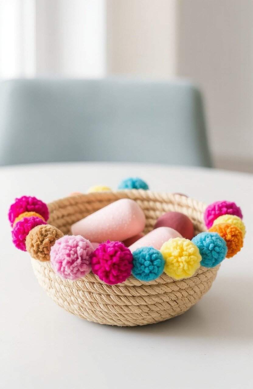 Pom-poms add a burst of fun to any rope bowl. It’s like having a little party on your table. Perfect for kids’ rooms or playful spaces.