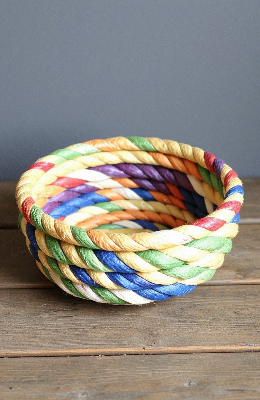 Playing with layers can create depth and interest. Use ropes of different colors or textures. This bowl is perfect for a modern, artistic look.