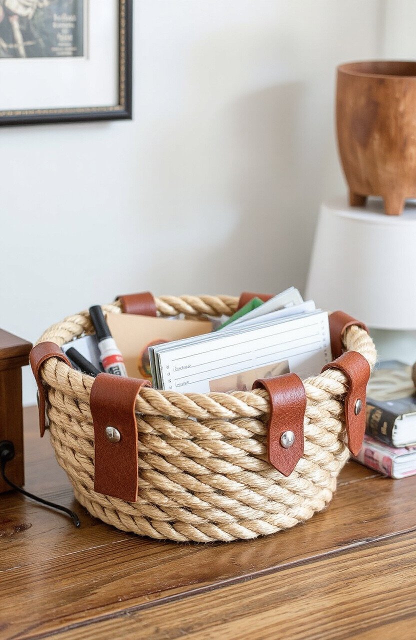 Leather adds a touch of sophistication to rope bowls. Use leather strips or patches for added flair. Perfect for a modern or industrial look.
