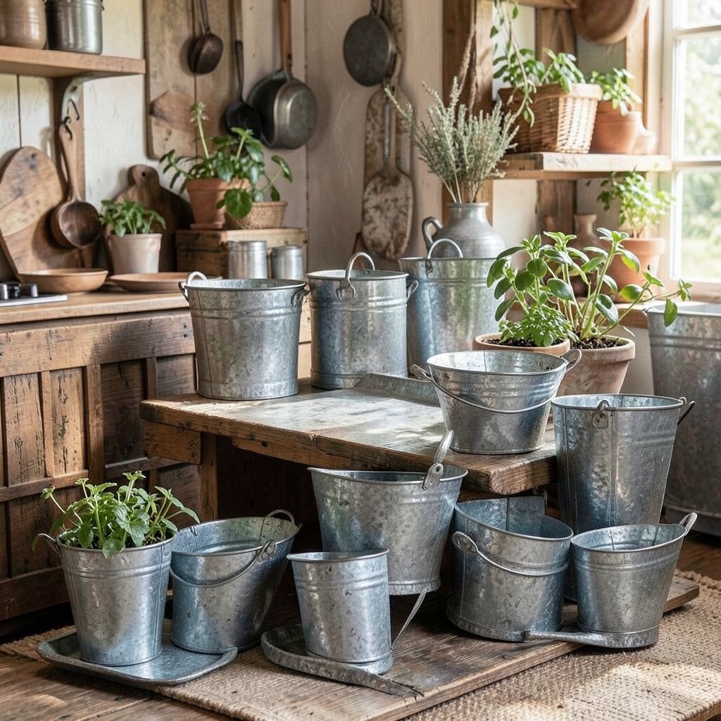 Galvanized metal accents add an industrial edge to rustic decor. Think buckets, planters, or trays that bring a bit of shine and contrast.