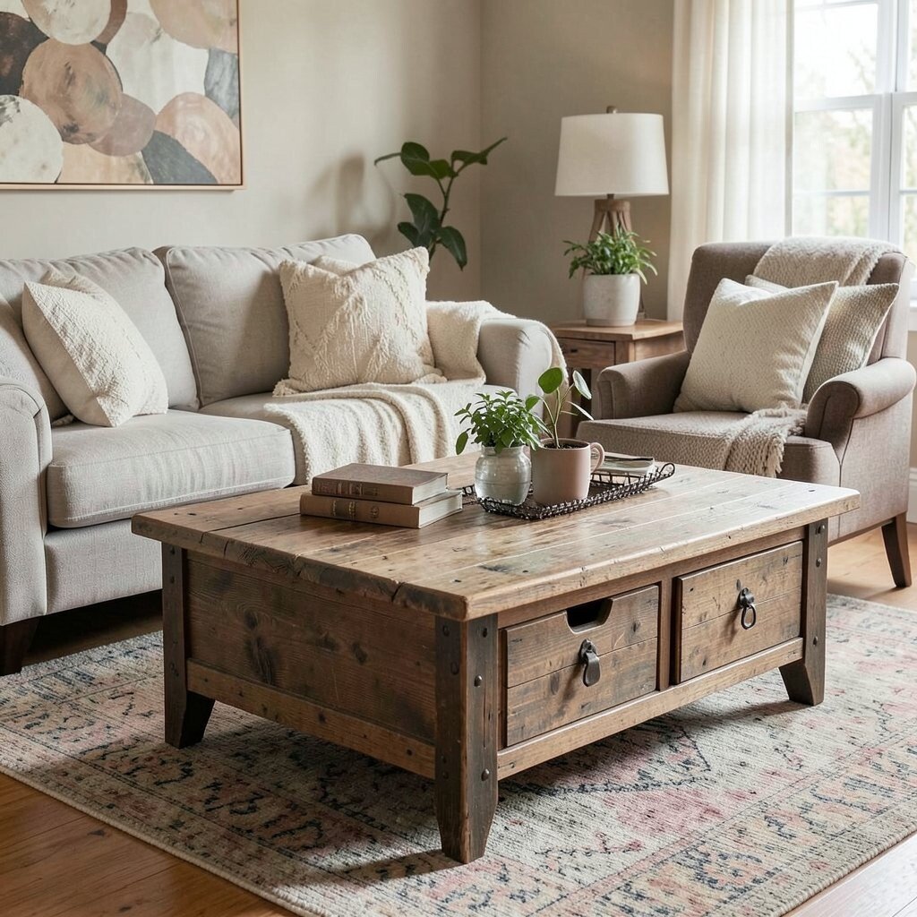 A rustic coffee table can be the centerpiece of your living room. Its sturdy, wooden design is both functional and inviting, perfect for gathering around with friends and family.