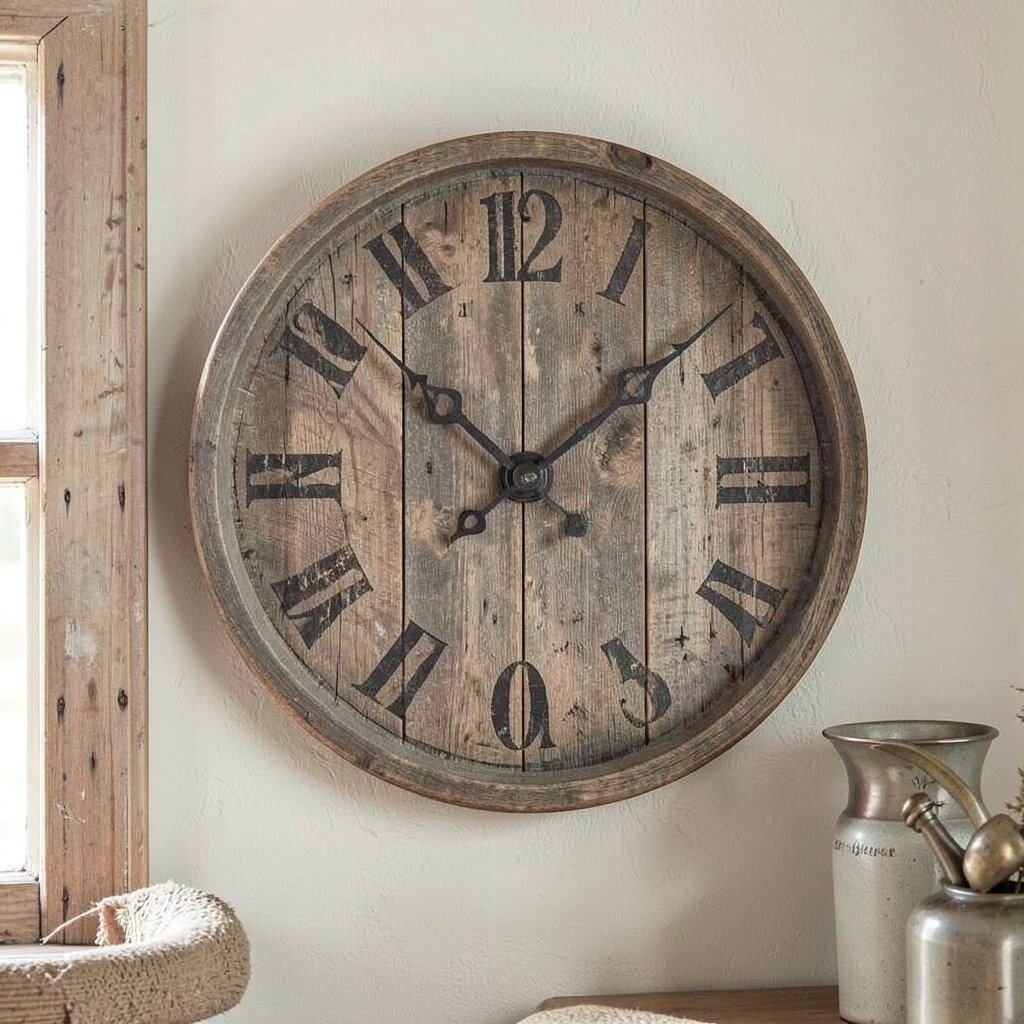 A rustic wall clock can be a functional and decorative piece in your home. With its weathered wood and large hands, it adds a vintage charm to any room.