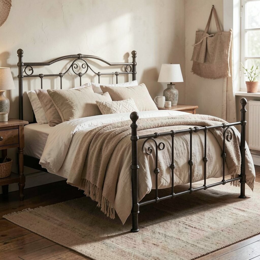 You can pair it with soft linens and cushions for a cozy feel. Iron bed frames are durable and can be found for $200 to $600, depending on size and detail.