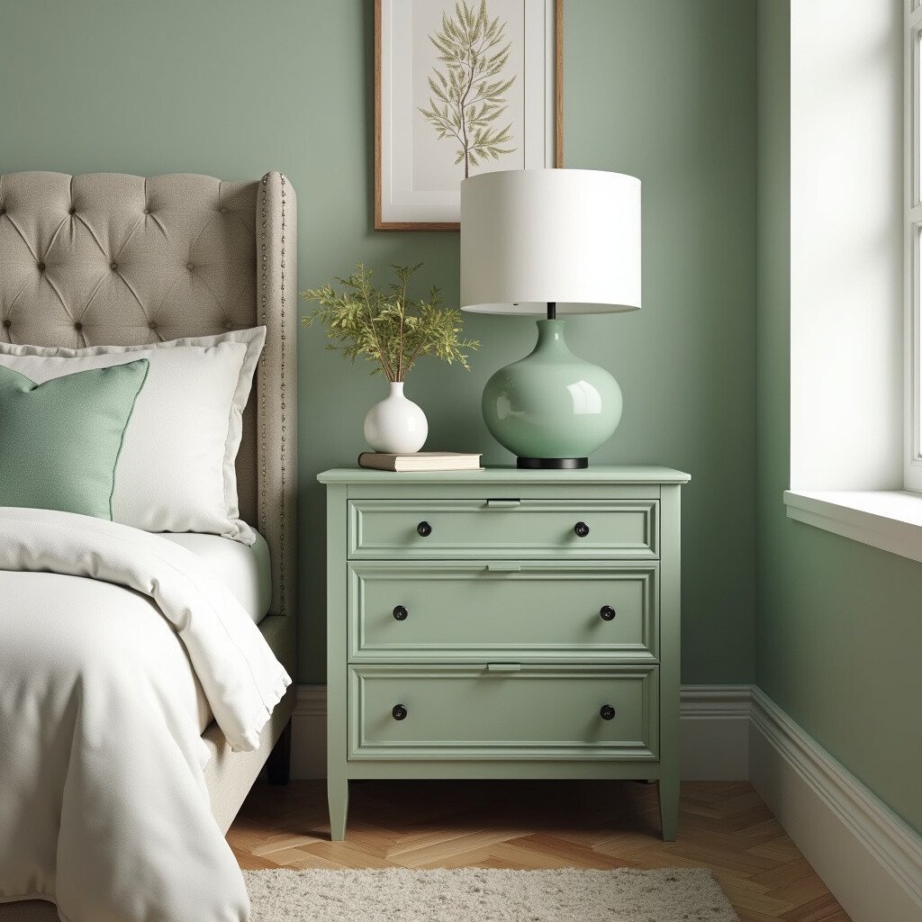 A bedside table in sage green can be a charming addition to your bedroom. It’s perfect for adding a pop of color in a subtle way. Choose a style that complements your existing furniture for a harmonious look.