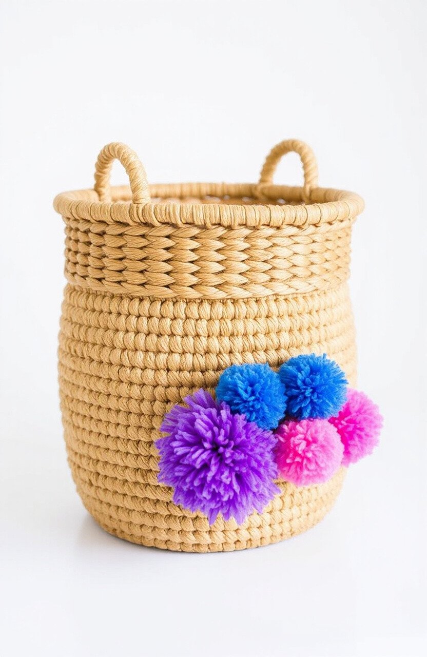 Add a touch of whimsy with pom poms! A seagrass basket with pom poms is fun and youthful. It’s great for a playful décor style.