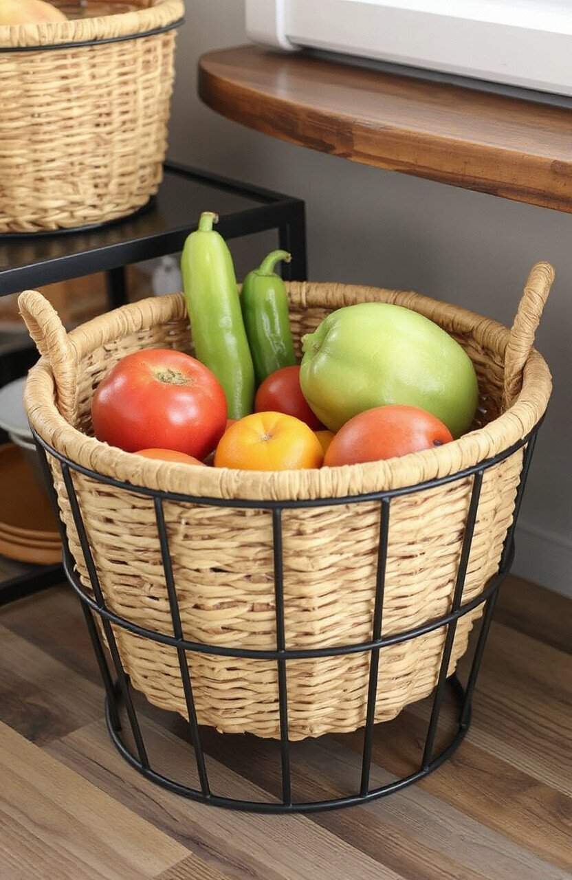 Use it in the kitchen for storing fruits and vegetables. The metal frame adds durability and style.