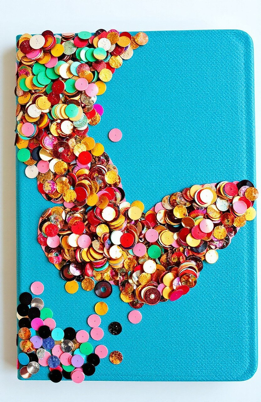 Give your journal a makeover with sequins. Cover the front with your favorite colors and patterns. It’s as simple as gluing sequins onto the cover for a personalized touch.