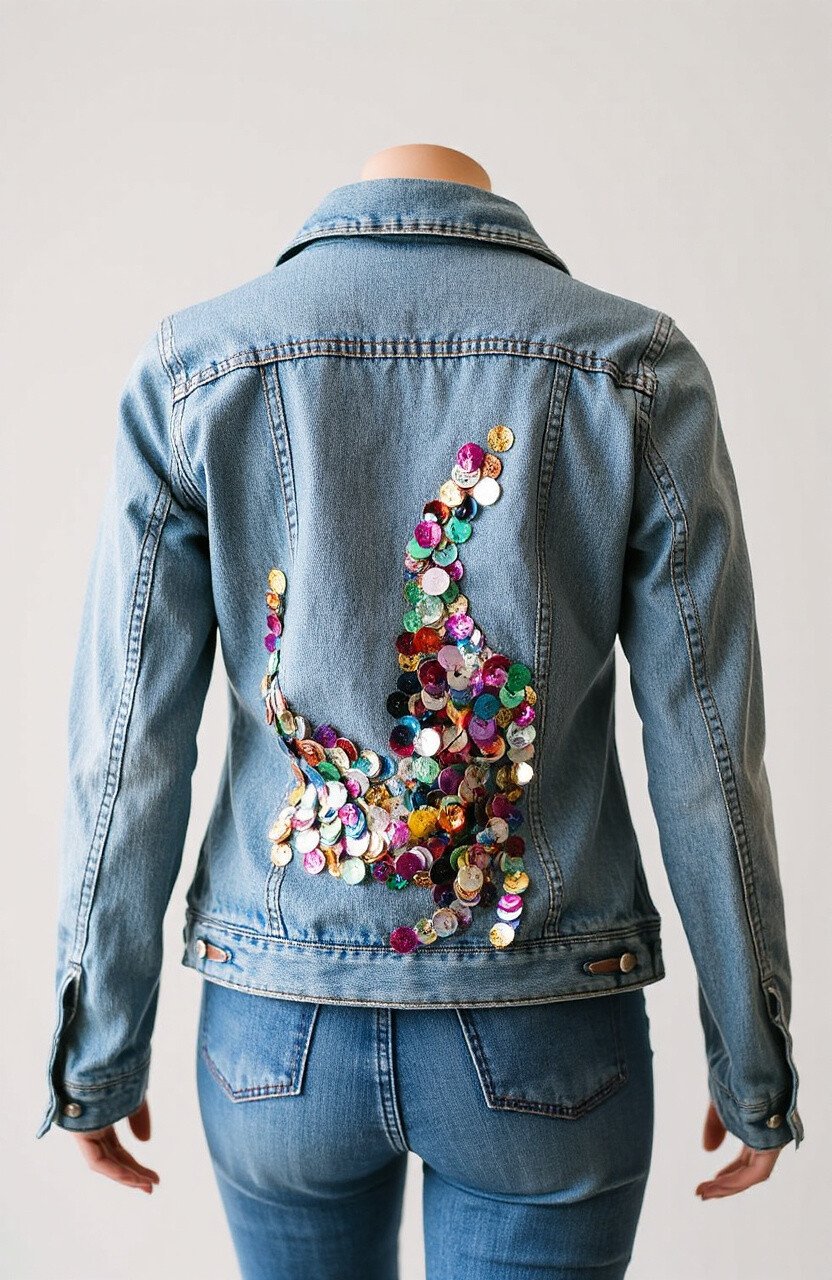 Take your denim jacket from drab to fab with sequins. Add them to the back, sleeves, or pockets for a unique twist. Go for a full back design or small accents for a subtler look.