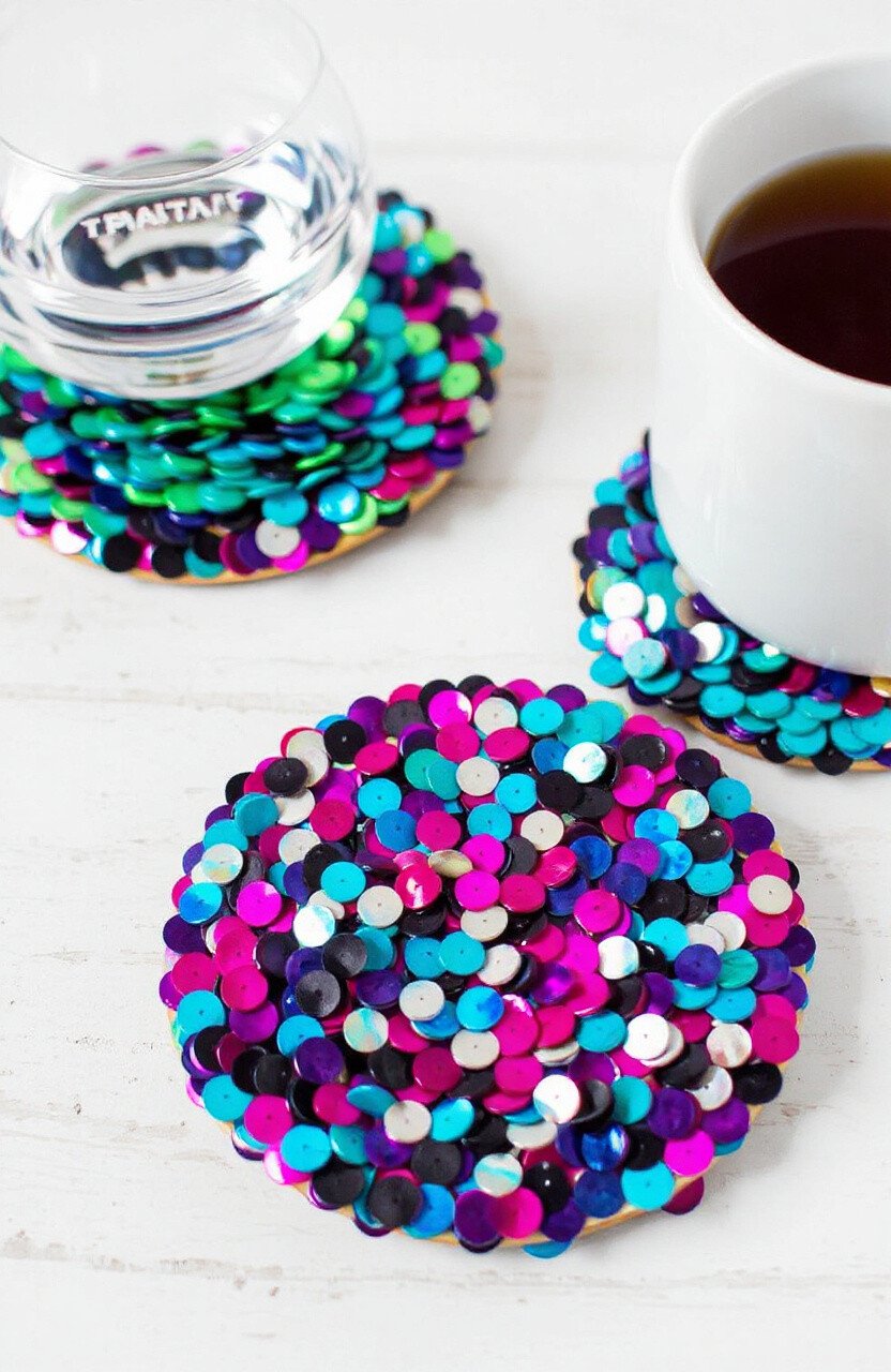 Protect your surfaces with style using sequin art coasters. Add sequins to plain coasters for a fun, sparkly look. You can create patterns, images, or just cover them for a full glam effect.